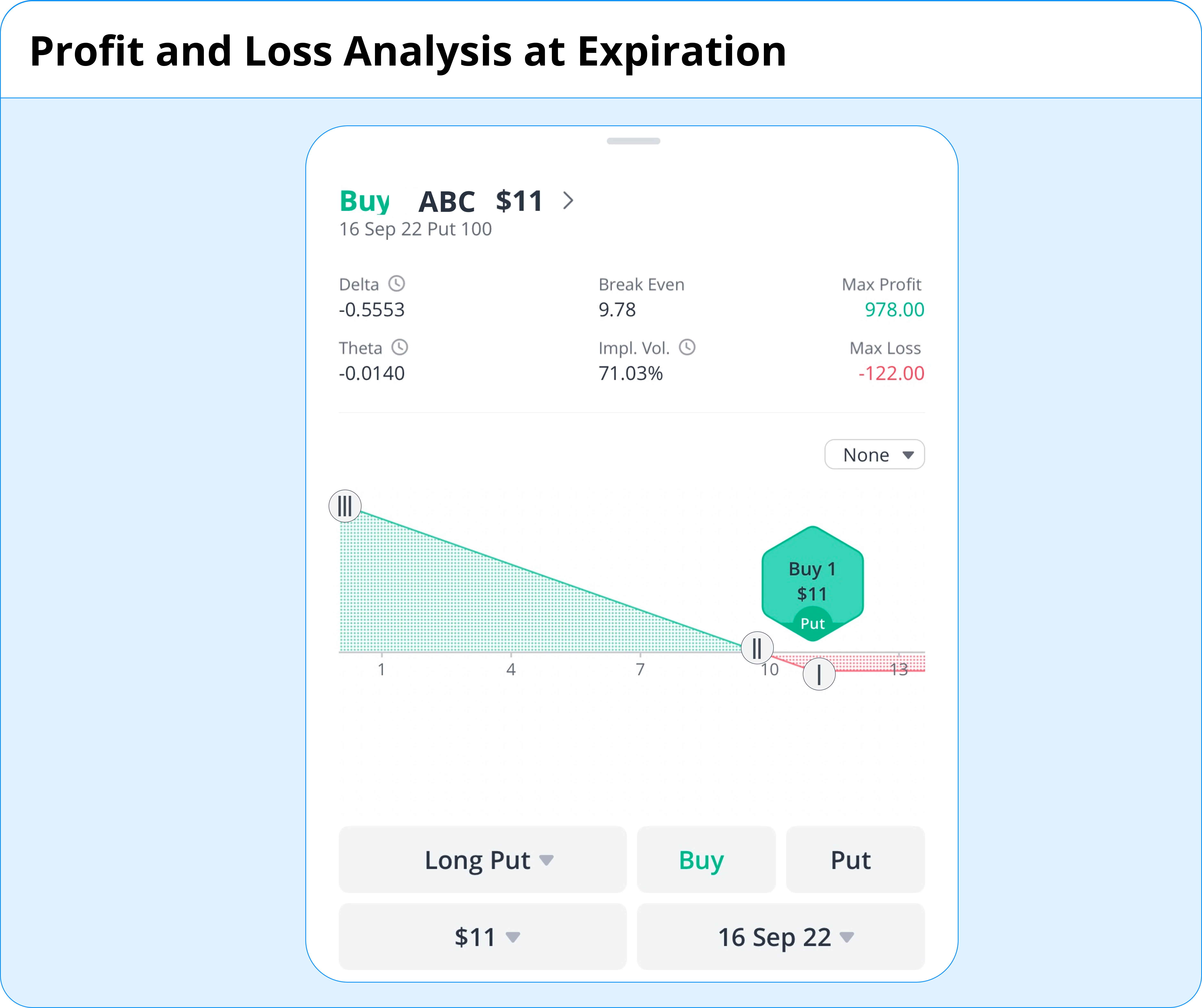สมมติว่านักลงทุนมองว่าแนวโน้มหุ้น ABC เป็นขาลง ดังนั้น เขาจึงตัดสินใจซื้อ Put Option อ้างอิงหุ้น ABC จำนวน 1 สัญญาที่ราคาใช้สิทธิ์ 11 ดอลลาร์ หมดอายุวันที่ 16 กันยายน 2022 และค่าพรีเมียมของสัญญาออปชันนี้อยู่ที่ 1.22 ดอลลาร์ เขาสามารถประเมินความเสี่ยงและผลตอบแทนที่จะได้จากการถือครองออปชันนี้จนหมดอายุได้ดังนี้