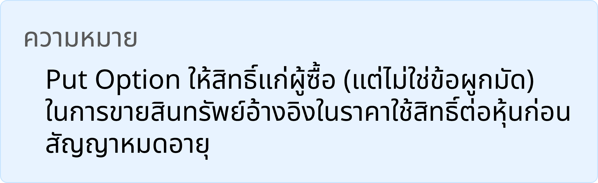 ตอนไหนที่เหมาะในการซื้อ Put Option: กลยุทธ์การซื้อ Put Option อาจเป็นทางเลือกที่ดีสำหรับนักลงทุนที่คาดว่าราคาหุ้นจะร่วงลงอย่างรวดเร็วก่อนที่ออปชันจะหมดอายุ หากราคาหุ้นปรับตัวลงต่ำกว่าราคาใช้สิทธิ์เพียงเล็กน้อย กำไรที่ได้มาจากการใช้ออปชันอาจไม่มากพอที่จะชดเชยค่าพรีเมียมที่จ่ายไป ซึ่งจะทำให้คุณขาดทุนจากการลงทุนครั้งนี้ การซื้อ Put Option ถือเป็นอีกหนึ่งกลยุทธ์ดั้งเดิมและเป็นที่นิยมสำหรับการเก็งกำไรในช่วงที่หุ้นอยู่ในช่วงขาลง