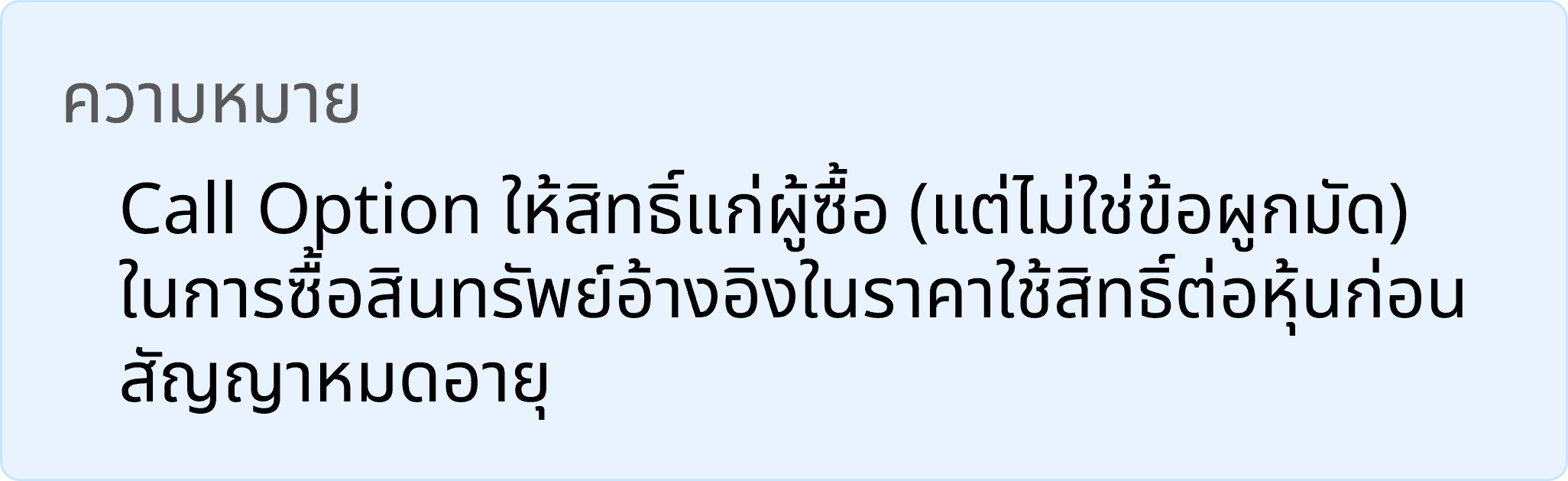 เรามาดูลักษณะสำคัญของสัญญาออปชันกัน จะช่วยให้คุณเข้าใจความแตกต่างระหว่างออปชันและหุ้นได้ดียิ่งขึ้น