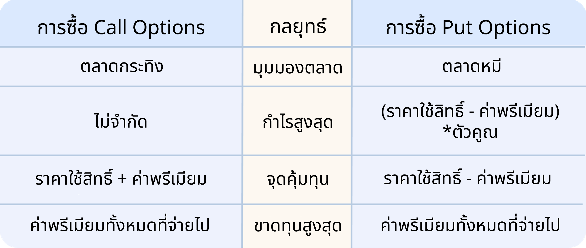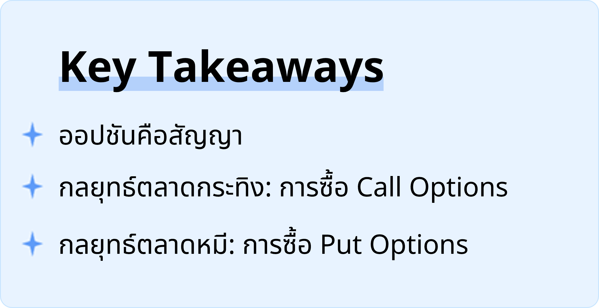 ออปชันเป็นเครื่องมือที่มีความหลากหลายและปรับเปลี่ยนได้อย่างยืดหยุ่น ทำให้สามารถเทรดได้ในทุกทิศทางของตลาด ไม่ว่าจะเป็นเทรนด์ขาขึ้น ขาลง หรือแม้แต่ Sideway กลยุทธ์ออปชันมีความหลากหลายตั้งแต่แบบพื้นฐานไปจนถึงระดับซับซ้อน แต่ทุกกลยุทธ์ต่างมีรากฐานจากออปชันสองประเภทหลัก ได้แก่ Call และ Put