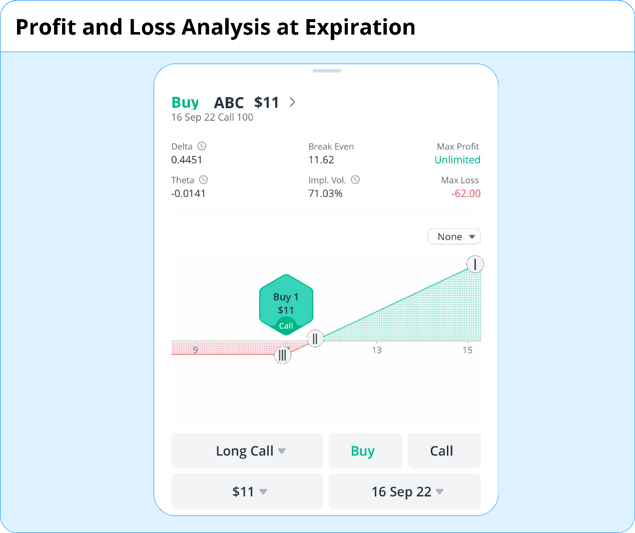 สมมติว่าราคาหุ้น ABC ซื้อขายที่ราคาประมาณ 10.24 ดอลลาร์ คุณมีมุมมองว่าหุ้น ABC มีแนวโน้มเป็นขาขึ้น คุณจึงซื้อ Call Option อ้างอิงหุ้น ABC จำนวน 1 สัญญาที่ราคาใช้สิทธิ์ 11 ดอลลาร์ หมดอายุในวันที่ 16 กันยายน 2022 และค่าพรีเมียมของสัญญาออปชันนี้อยู่ที่ 0.62 ดอลลาร์ ความเสี่ยงและผลตอบแทนของคุณจะเป็นอย่างไรหากคุณถือสัญญานี้จนถึงวันหมดอายุ?